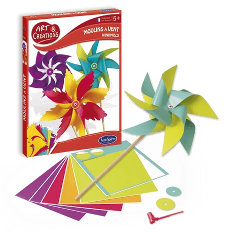 Hobby creativo per stimolare la creatività e l'abilità manuale. Crea 3 graziosi mulini a vento bicolori con dei fogli di carta stampati su entrambi i lati e già perforati.