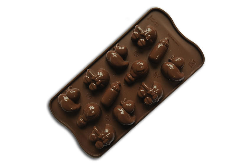Stampo in silicone antiaderente per realizzare 12 simpatiche forme come biberon, passeggini, e paperelle.