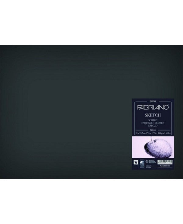 Libro per schizzi con 80 fogli di carta da 110 g/m². Carta acid free, certificata FSC. Copertina nera rigida e lavabile, rilegatura con spirale o cucitura filo refe. Ideale per matita, pastello, penna.