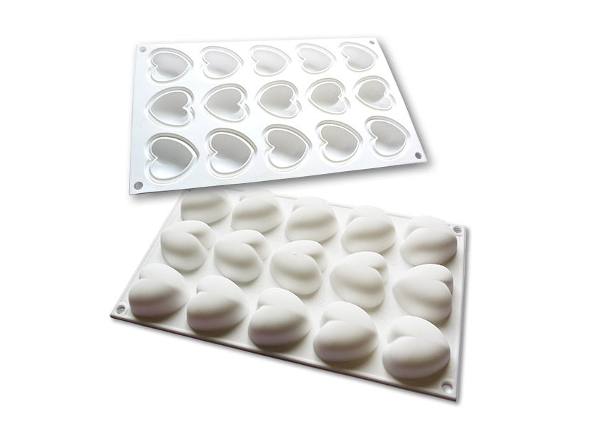 Stampo in silicone monoporzione e antiaderente per ideare 15 tenerissimi cuori dalla forma morbida.