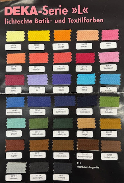 Tingere: Il contenuto della bustina è sufficente per 250 gr. Di stoffa asciutta. Sciogliere la polvere colorata con 2 cucchiai di sale in 4-5 litri di acqua bollente, dopodiche procedere cone le suddette iscrizioni. A seconda del tipo di stoffa, la soluzione colorata può essere regolata fino a 90°C. Tingere: Con il fissativo 111 “L” si aumenta la resistenza del colore al lavaggio a mano e in lavatrice a 30°C.