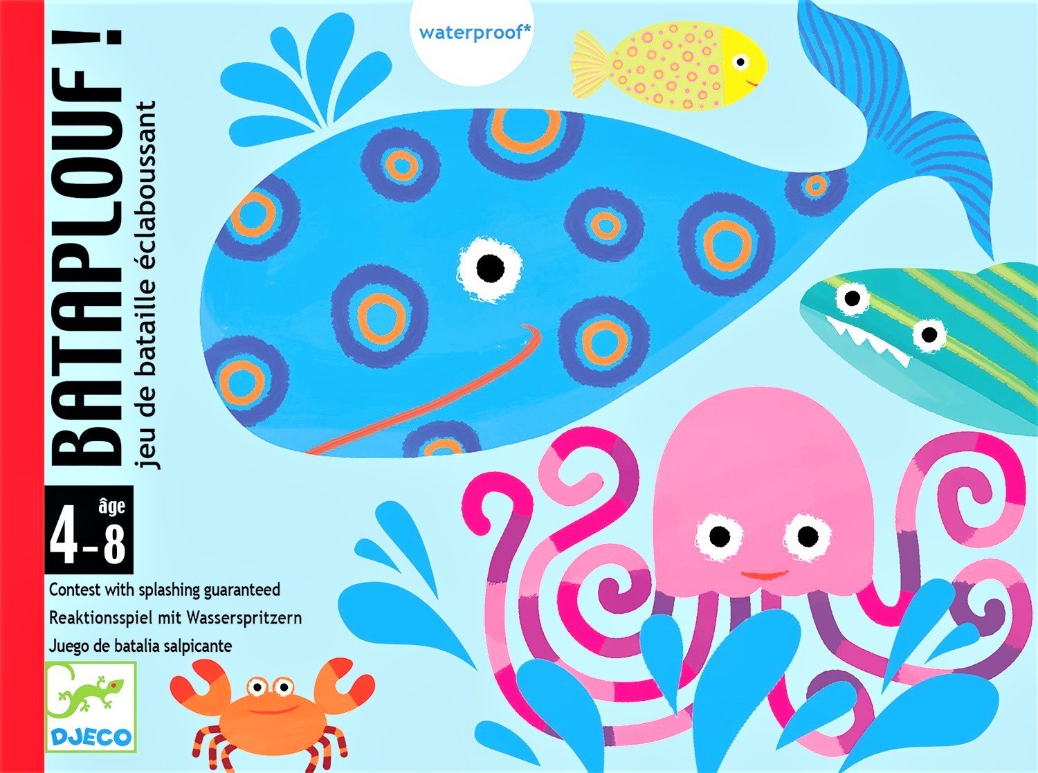 Un gioco di carte impermeabili..puoi giocare in piscina o al mare. Si distribuiscono 10 carte ciascuno e si lasciano galleggiare liberamente gli animali marini. I giocatori tengono in mano il proprio mazzetto e girano contemporaneamente una carta. La carta più alta (da 1 a 5 bolle) vince l'altra, che verra' catturata e messa sotto al mazzetto. Quando vengono girate due carte con lo stesso animale, attenzione! Inizia la lotta-schizzo! Chi sarà il più veloce ad acchiappare l'animale che ha scatenato la lotta? Il giocatore che si aggiudica tutte le carte vince la partita.