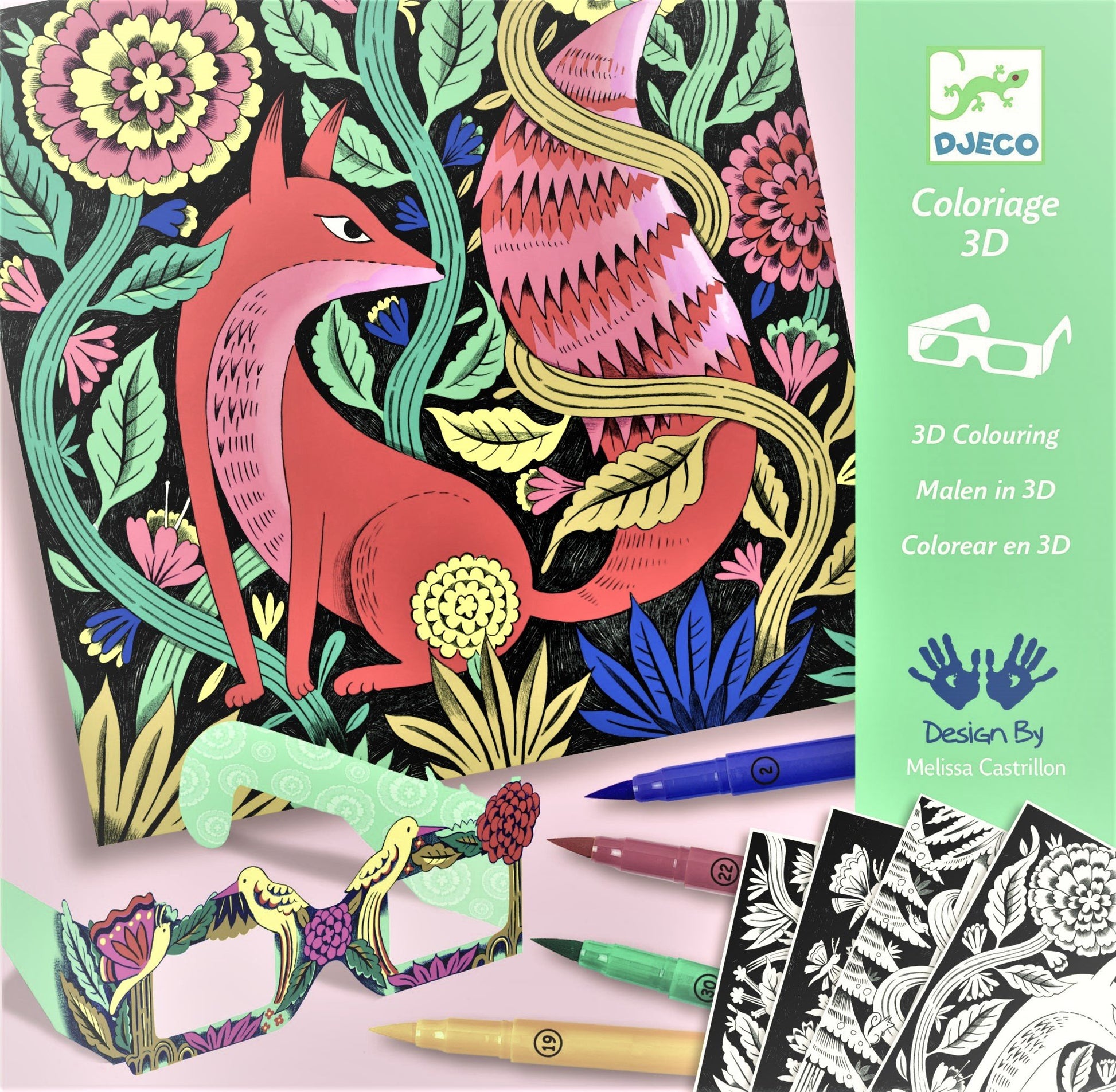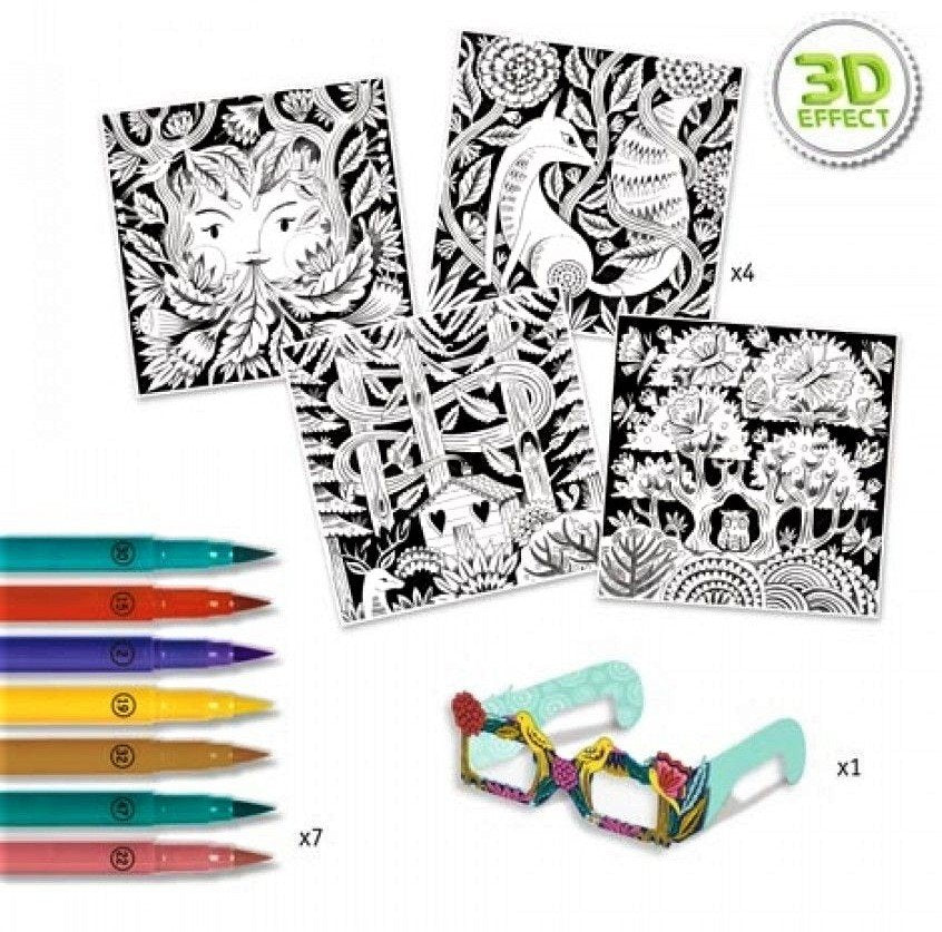 Crea le tue immagini in 3D! 4 fantastiche illustrazioni da colorare. Quando hai completato il lavoro, indossa gli occhialii 3D in dotazione. Vedrai il tuo capolavoro con fantastiche illusioni ottiche.