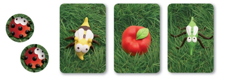 Contenuto: 48 carte (16 Zanzare, 16 Api, 16 Mele) 7 figurine (4 Api, 1 Zanzara, 1 Fiore, 1 Mela) 25 gettoni Coccinelle.