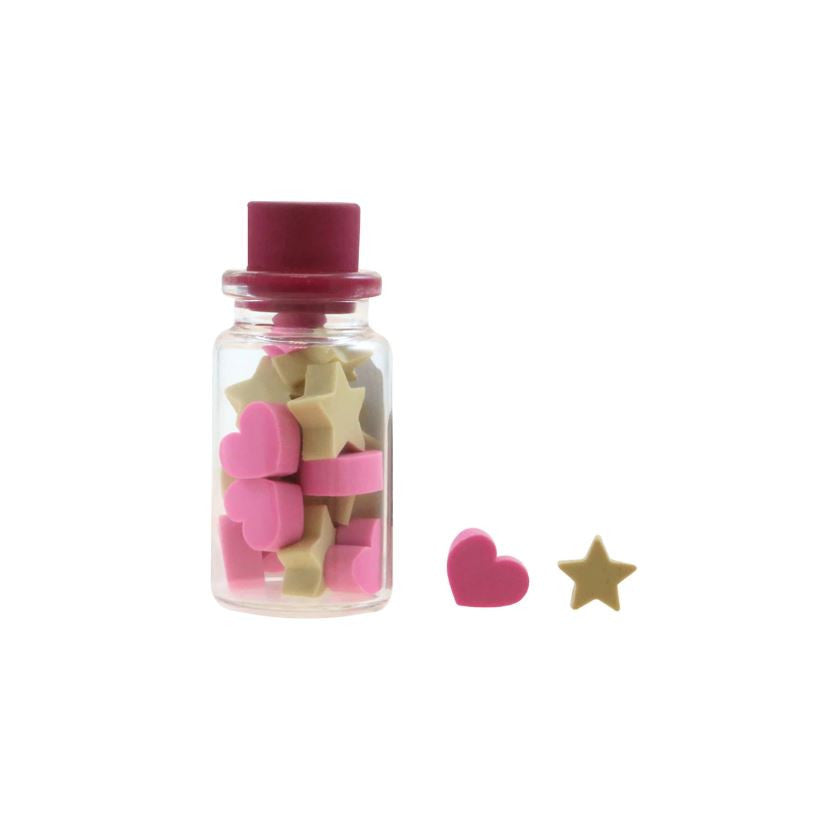 Una cancelleria essenziale, queste mini gomme sono il perfetto compagno di scrivania. A forma di cuori e foglie innamorati e conservato in una bottiglia di vetro decorativa con opere d'arte originali Gorjuss.