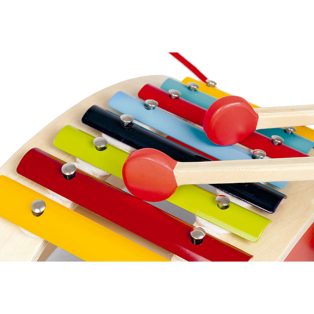 Xilofono con ruote in legno (compensato per la parte curva, faggio per le ruote, melaleuca per le bacchette). 8 lamelle in metallo. Stampa sulle ruote a trasferimento termico. Guarnizioni in caucciù fissate intorno alle ruote per renderle silenziose quando il bambino trascina il giocattolo. Scala musicale diatonica Giocattolo 2 in 1 : xilofono per i piccoli musicisti in erba e giocattolo a traino per portarlo ovunque durante i primi passi.