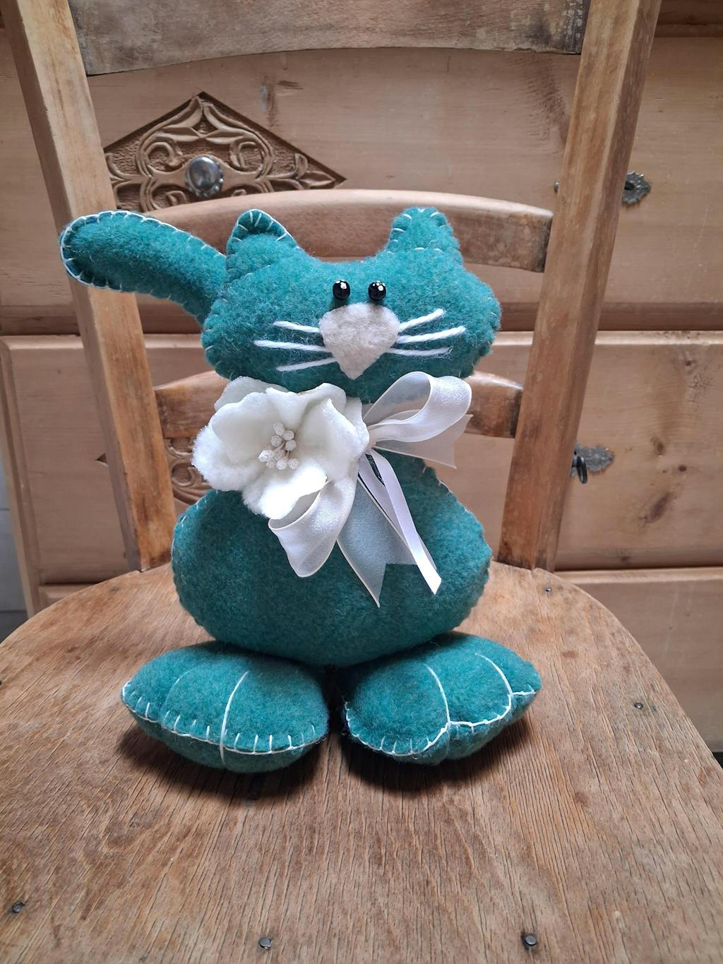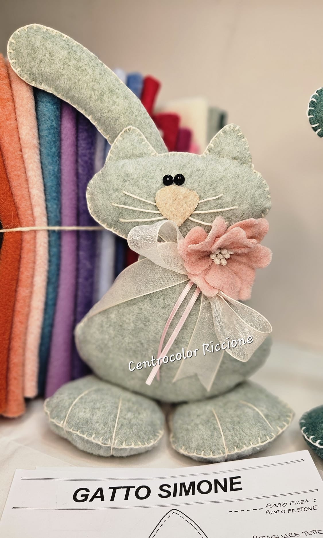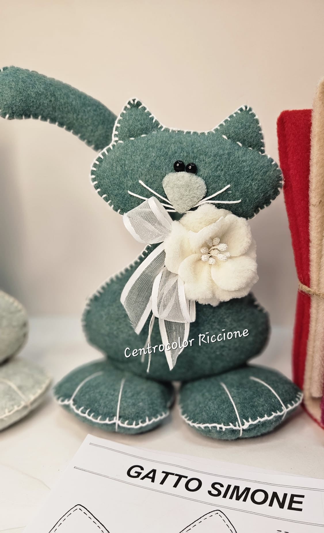 Una matassina di filo, il feltro nei vari colori per la realizzazione del gatto e le sue decorazioni, occhi e nastri vari.