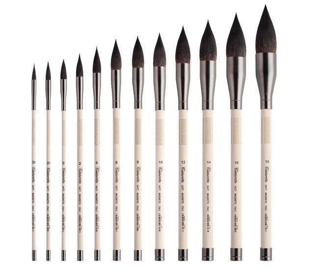 Pennello Bombasino Magneto Tintoretto, Serie 1477! Il filato sintetico Vajo Kazan rende questo pennello perfetto per l'acquerello. La particolarità consiste nella presenza di supermagneti in neodemio all'estremità del manico che permettono al pennello di rimanere appeso a qualsiasi supporto metallico ferromagnetico.