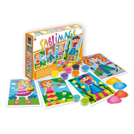 Sablimage: La magia dell'arte con la sabbia! Ideale per i bambini per sviluppare la creatività e l'abilità manuale senza sporcarsi. Basta rimuovere le superfici pre-tagliate con base adesiva e cospargere i diversi colori in sabbia. Il kit contiene: • dai 15 ai 18 vasetti di sabbia • 4 immagini prestampate • 1 foglio d'istruzioni
