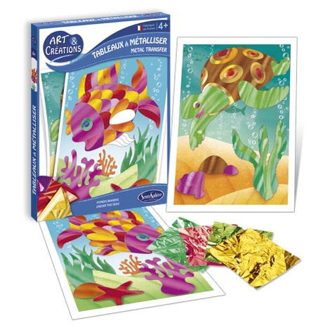 Tableaux à Métalliser: Hobby creativo per stimolare la creatività e l'abilità manuale. Speciale e magica tecnica per dare vita al tuo disegno, trasferendo i pigmenti metallici sul foglio con parti del disegno già pre-tagliate e pre-incollate; togliendo il foglio metallico sull'adesivo, aderirà magicamente. Ideale per i bambini!