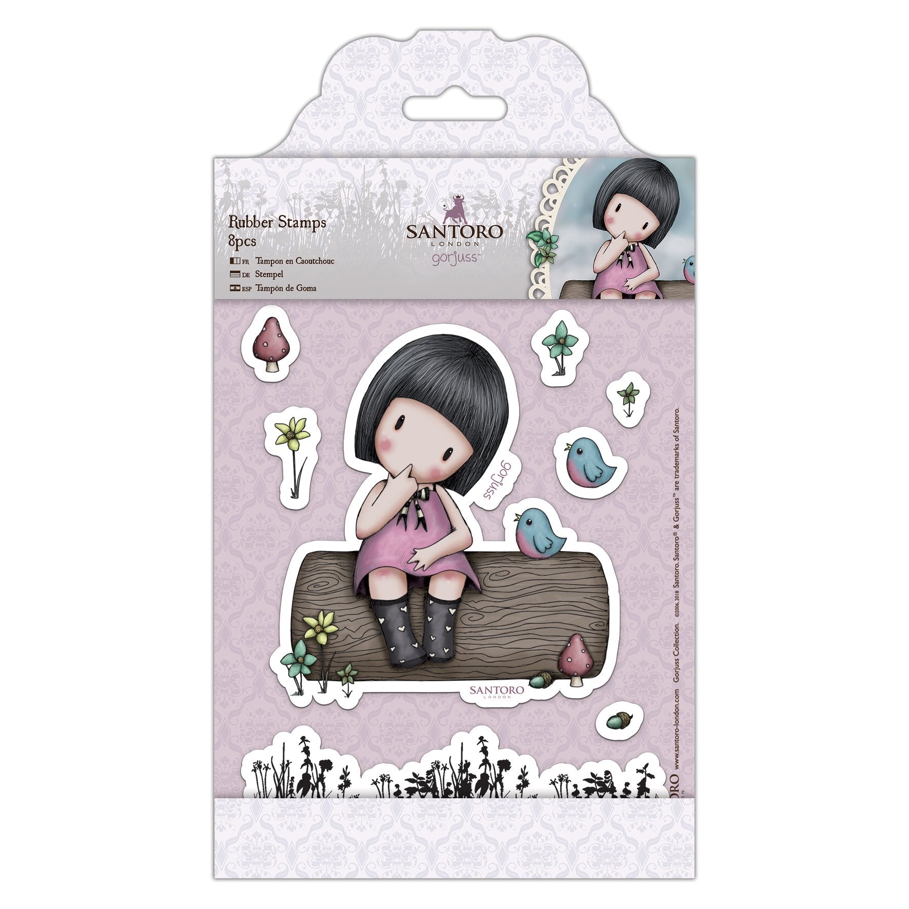 8 adorabili timbri con il personaggio Gorjuss, fiori graziosi, funghi e gli amici uccellini per la tua collezione primavera/estate.